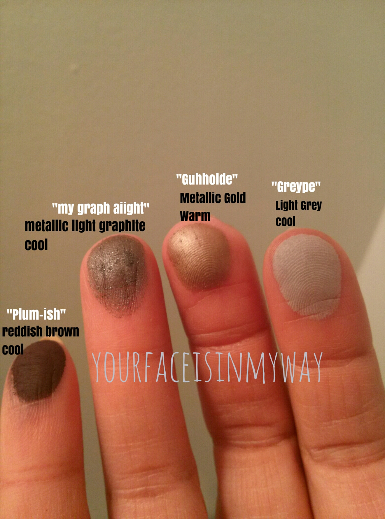 There are no exact names for each color listed on the palette. I made up my own basic names. I’m basic, so it works out.