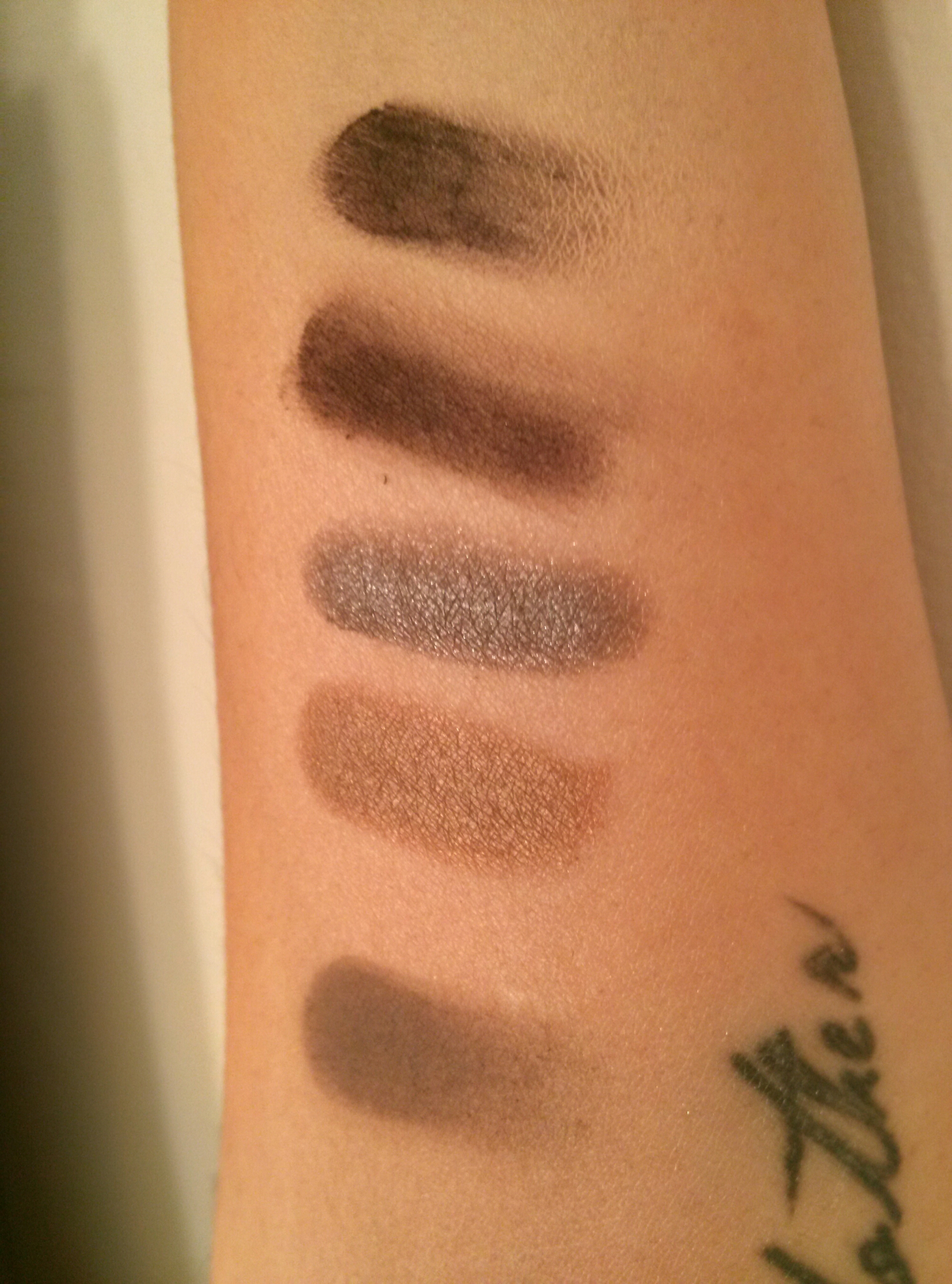 Below I attempted to swatch the colors on my forearm. 3 of the 4 colors swatched awesomely. The actual Plum Velvet color swatched like a powdered poop streak. I even tried that color over the original Urban Decay Primer Potion to see if that would help. No. It didn’t help. Notice the top two swatches.
