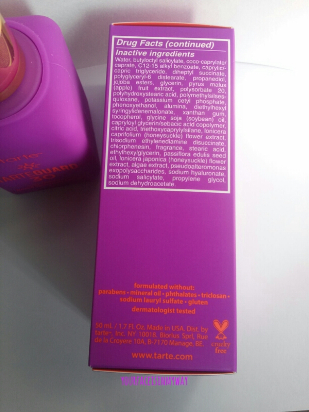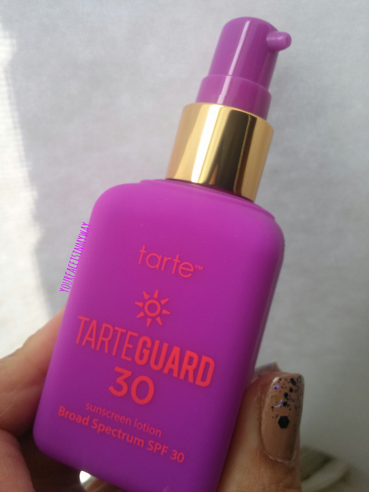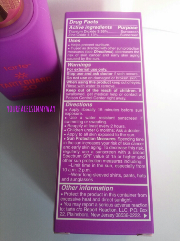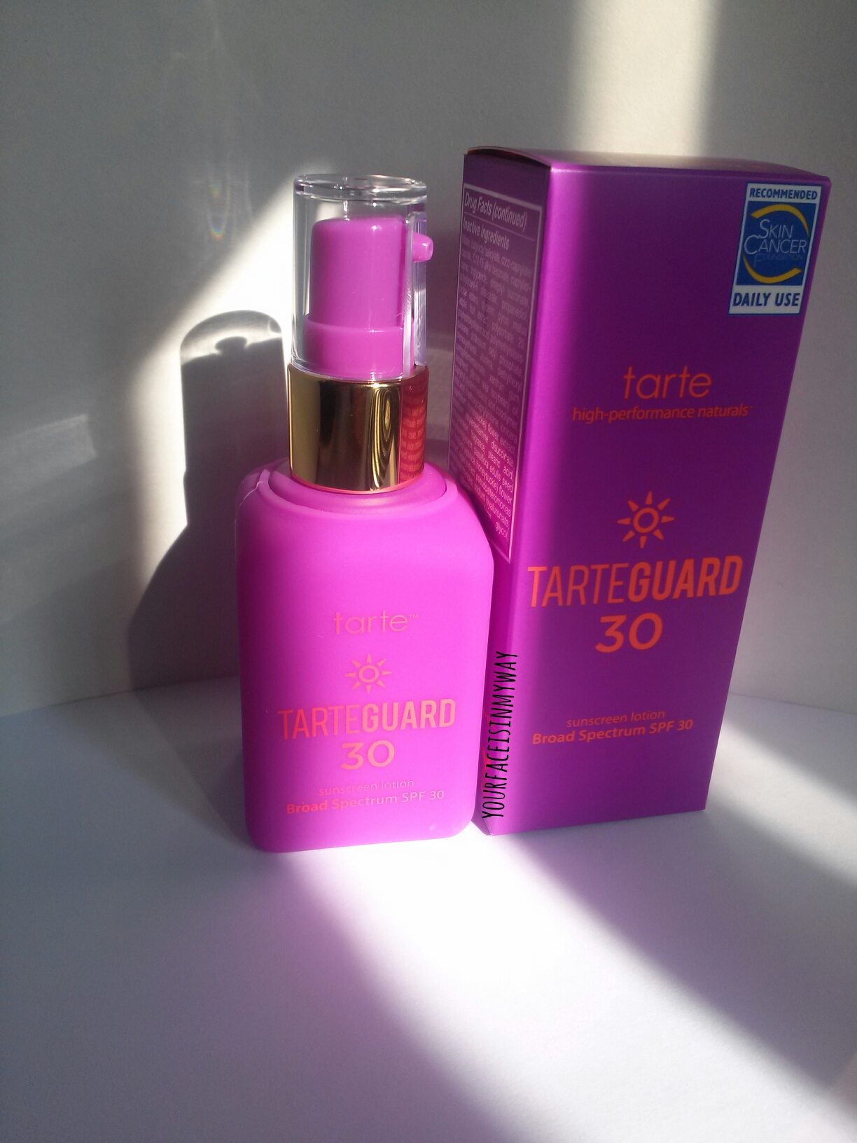 I just got the new TarteGuard 30. This is a brand new product on the market and a first for Tarte. This is not a chemical based sunscreen! Sunscreen snobs rejoice. Titanium Dioxide and Zinc Oxide are the sunscreens listed.