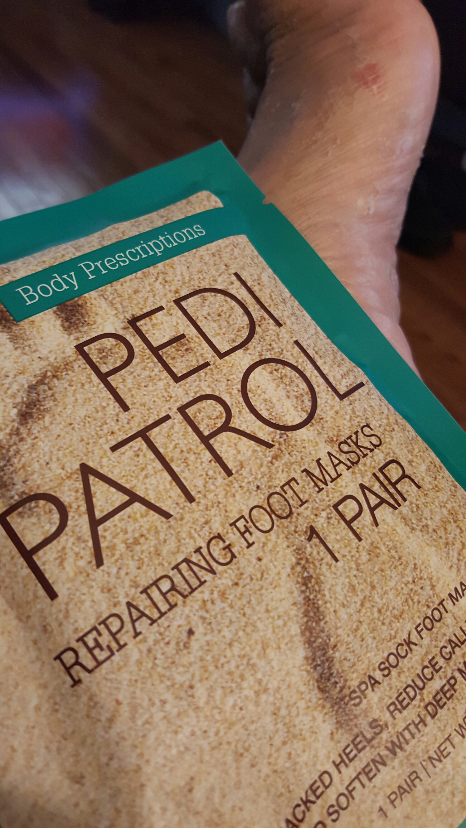 I was in Marshall’s a few weeks ago wandering around aimlessly with $7 in my pocket. I look on the most unorganized shelf ever and decided it was my duty to organize it, as a customer who suffers from OCD. 9 minutes in I saw these Pedi Patrol Foot Treatment masks. $4.99 to exfoliate my feet? Yes. I finished up my shelf work as several employees looked on in confusion different areas in the beauty department.